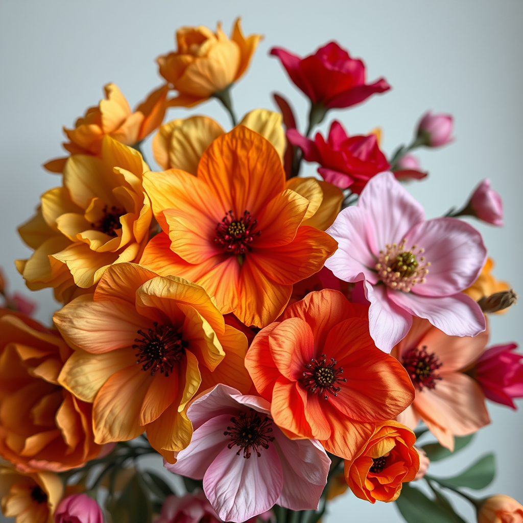 Photography of a delicate arrangement of blossoms displayed as an art nouveau masterpiece; the flowers are vibrant and strikingly beautiful, predominantly featuring shades of gold, ochre yellow, crimson red, violet, and muted pink. These blossoms are crafted from a mix of crumpled paper and silk, creating a unique texture. Captured in 8k high resolution, the image is professionally color graded with a focus on the frontal perspective at f/1.4 using a 50mm lens. The visual aesthetic is complemented by subtle imperfections and mood-enhancing elements.