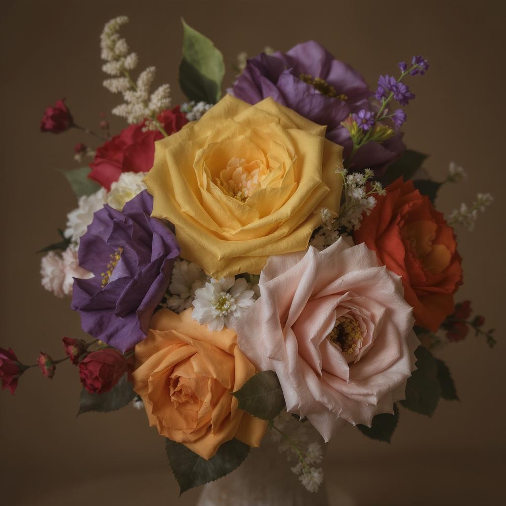 Photography of a delicate arrangement of blossoms, showcasing the elegance of Art Nouveau. The flowers are vibrant and beautiful, featuring a palette of golds, ochre yellows, crimson reds, violets, and muted pinks. Crafted from crumpled paper and silk, the blossoms exude a sense of intricate artistry. Captured in 8k high resolution with professional color grading, the image is taken from the front using an f/1.4 aperture and a 50mm lens, ensuring a stunning depth of field. Technical elements like bad-picture-chill-75v, BadDream, easynegative, and ng_deepnegative_v1_75t are subtly incorporated to enhance the visual experience.