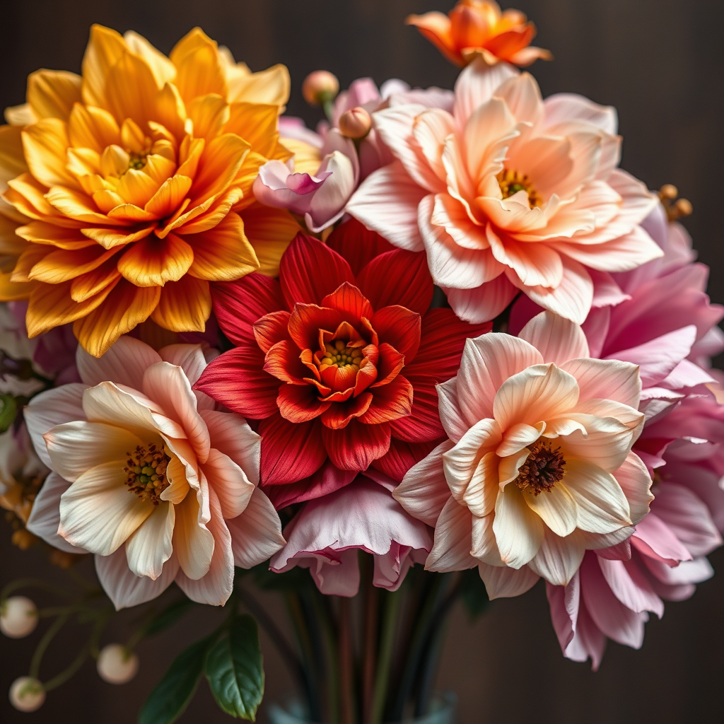 Photography of a delicate blossoms arrangement showcasing vibrant and beautiful flowers reminiscent of art nouveau, with a color palette dominated by golds, ochre yellows, crimson reds, violets, and muted pinks. The flowers appear crafted from crumpled paper and silk, captured in 8k high resolution with professional color grading. Shot from the front with a 50mm lens at f/1.4, this image embodies a dreamy, artistic essence while maintaining a touch of realism.