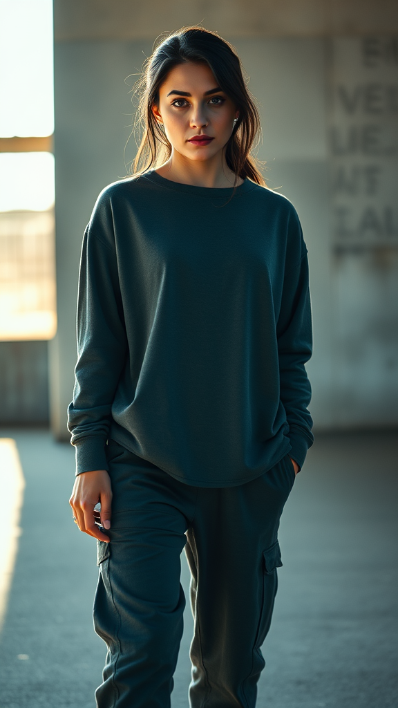 Photography of a dynamic shoot featuring a professional female model in a front shot, directly engaging the camera with a captivating stare. Captured with a Sony α9 II and a Sony FE 100-400mm f/4.5-5.6 GM OSS lens for clear, high-definition imagery. Model is dressed in an over-sized dark grey long-sleeve top and matching dark grey cargo jogger pants, paired with classic Vans skateboard shoes, adding an effortless, urban edge. The scene is enhanced with photorealistic textures and rich detailing, illuminated by dramatic sunlight that highlights the model's refined silhouette against a backdrop. Inspired by a raw, unfiltered style with a touch of creative flair, emphasizing natural yet striking elements in a tall 9:16 aspect ratio.