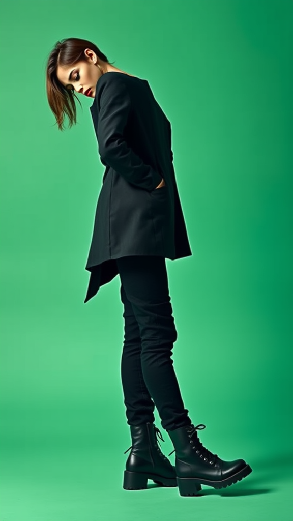 Photography of a female model in a striking upper body side pose, subtly leaning backwards at a 15-degree angle with her head gently tilted down. She sports a chic hairstyle, exuding a provocative look. Adorned in a minimalist, sleek black coat and black cargo jeans, her matte black military boots feature untied shoelaces, enhancing the edgy aesthetic. Set against a bold emerald gradient background, the image captures a dramatic silhouette with intricate details, embodying the essence of minimalist fashion.