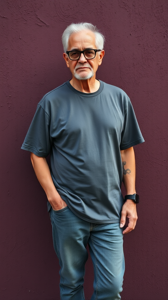Photography of a full-body shot featuring an older man model standing against a textured rustic plum wall, exuding an air of wisdom and experience. He wears a monochromatic charcoal grey T-shirt, showcasing a small, minimalist tattoo on his forearm, along with a sleek black Apple watch. He pairs his look with vintage black and white low-top sneakers, his silver hair stylishly coiffed, and dons chic black frame glasses. With one hand casually tucked in his pocket, he embodies a portrait of aged grace and urban fashion flair, radiating confidence. The image is photorealistic, ultra-detailed, and UHD, capturing the essence of street style and timeless elegance.
