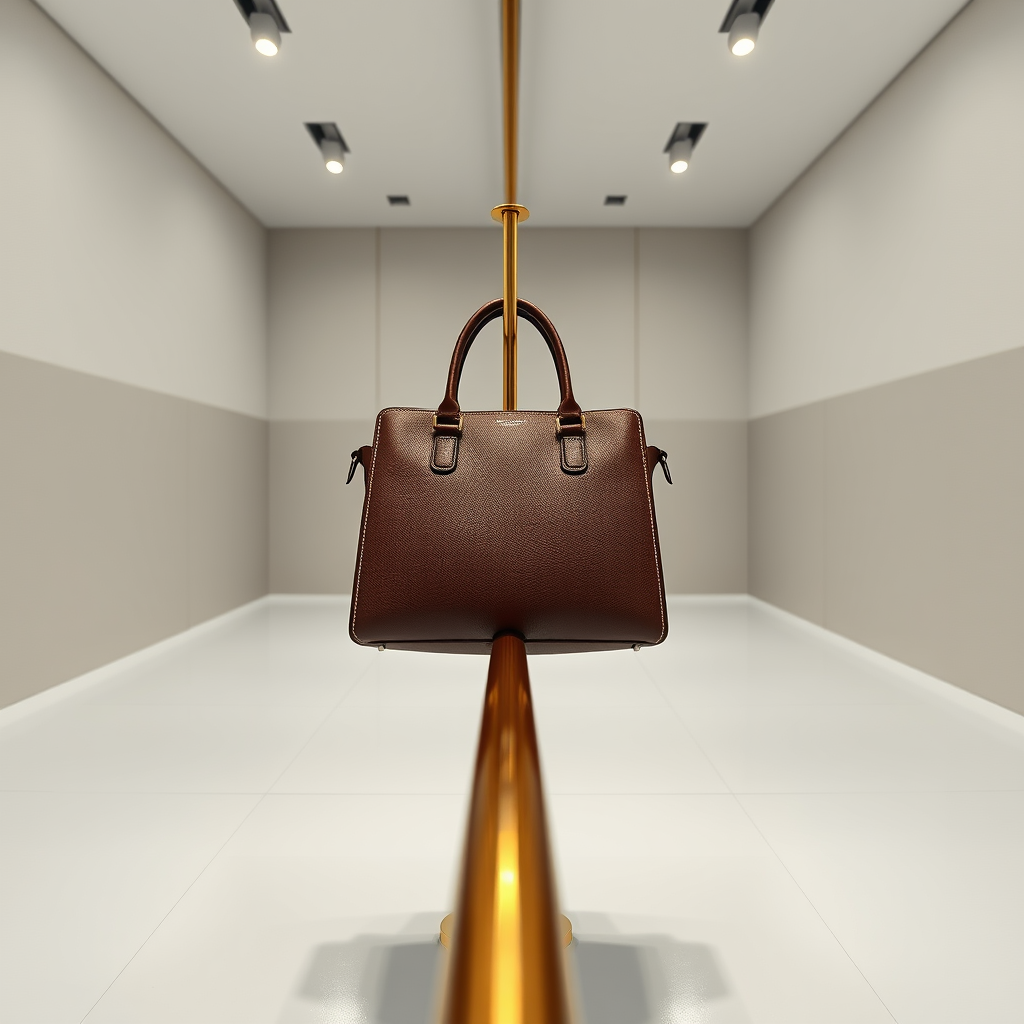 Photography of a luxury handbag elegantly poised on a slender golden rod, capturing the rich leather texture. The scene is set in a minimalist interior with a matte white epoxy floor and simple walls that add depth. Soft overhead spotlights gently illuminate the handbag, enhancing its luxurious appeal. The setting is rich in detail and captured from a front-facing perspective, offering a high-resolution, immersive view.