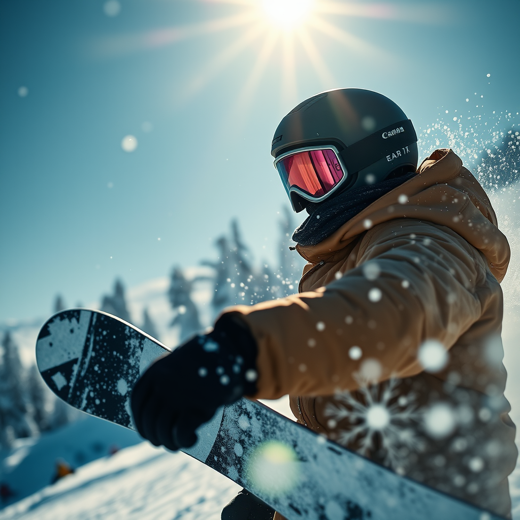 Photography of a professional snowboarder capturing dynamic action sports in the snowboard park, using the Canon EOS-1D X Mark III with a Canon EF 70-200mm f/2.8L IS III USM lens, showcasing depth of field. A clear and realistic image under sunlight with swirling snowflakes and a dramatic landscape offering rich detail. Adjusting the aspect ratio to 9:16, the style retains its raw essence, with personalized elements and a subtle stylized touch in version 6.1.