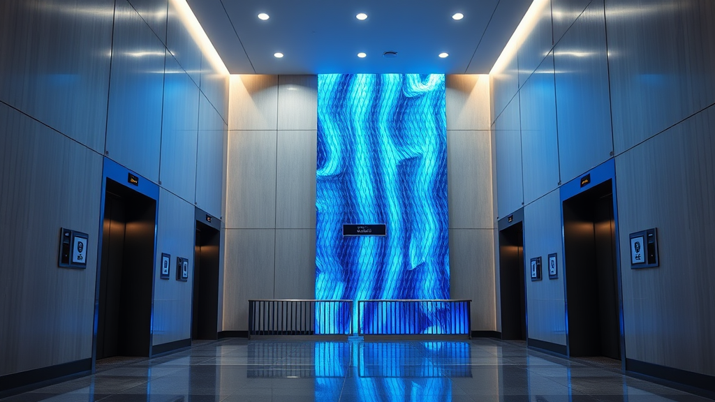 Photography of a sleek and minimalist elevator lobby in a corporate building, captured in a front view at eye level using a Canon EOS 5D Mark IV with an EF 24mm f/1.4L II USM lens at f/2.8. The lobby features a vertical media art installation as the centerpiece, exuding a dynamic, metallic sheen in shades of blue that ripple across its surface, offering a vibrant contrast to the understated elegance of the surroundings. Defined by clean lines, the lobby includes a modern control gate system for secure access. Materials used throughout are premium, chosen for their texture and reflective qualities, enhancing the luxurious ambiance. The setting showcases the height and grandeur of the lobby, focusing on the synergy between technology and art. Ultra-resolution detail highlights the material finishes and ambient lighting, with a sense of realism. The overall design harmoniously blends innovation with artistic expression, maintaining the core concept while allowing for small creative modifications.