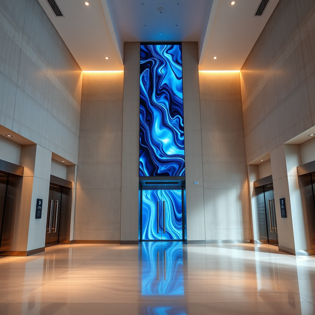 Photography of a sleek and minimalist elevator lobby in a corporate building, captured in a front view at eye level using a Canon EOS 5D Mark IV with an EF 24mm f/1.4L II USM lens, set at f/2.8. The lobby features a vertical media art installation as its centerpiece, with the art exhibiting a fluid, metallic sheen and rippling shades of blue, creating a vibrant contrast against the understated elegance of the surroundings. The space is defined by clean lines and a modern control gate system for secure access, with premium materials selected for their texture and reflective qualities, enhancing the luxurious ambiance. The height and grandeur of the lobby are showcased, emphasizing the harmony between technology and art, with ultra-resolution detail capturing the material finishes and ambient lighting. This scene encapsulates realism with focused lighting, style raw, and a sense of order and creativity coexisting.