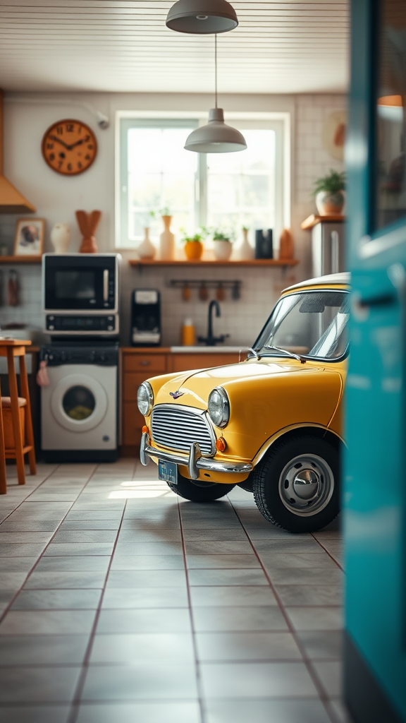 Photography of a vintage Mini car placed within a cozy kitchen setting, featuring professional color grading and gentle shadows, minimal contrast, with a clean and sharp focus. The scene is captured in 8k octane rendering, ensuring high resolution and extraordinary detail, resembling film photography. The room is well-lit with bright, natural HDR lighting, creating an inviting atmosphere and adding to the overall realism. The setting portrays a harmonious blend of retro and modern elements, maintaining the charm of a nostalgic yet contemporary space.