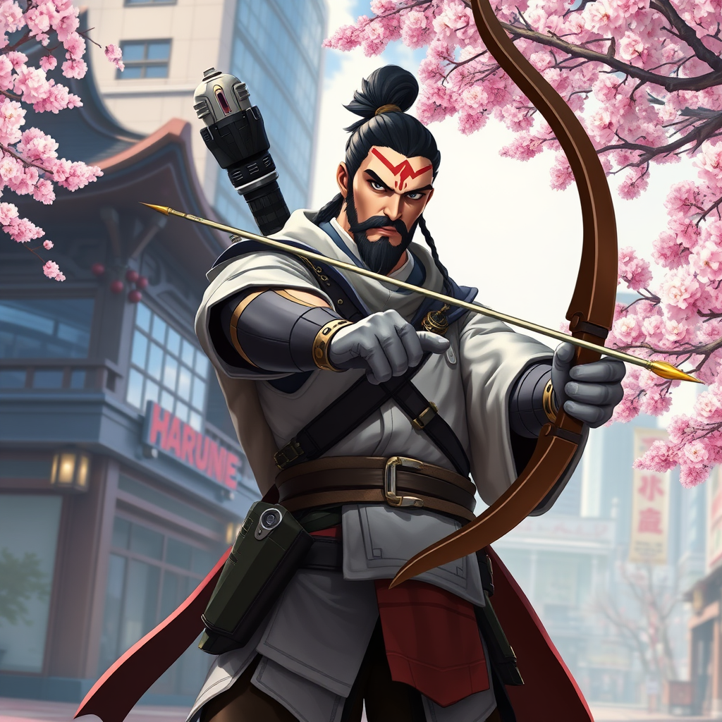 Photography of Hanzo from Overwatch standing in a realistic full-length pose with an intense expression, key light accentuating his facial features and traditional attire, captured in a poised archery stance. The setting embodies the game's futuristic yet culturally rich environment, featuring Japanese architecture, modern cityscapes, and cherry blossoms. The shot is a medium-wide angle, blending elements of Anime, Cartoon, Manga, CGI, and Video Game aesthetics with a touch of imaginative painting style.