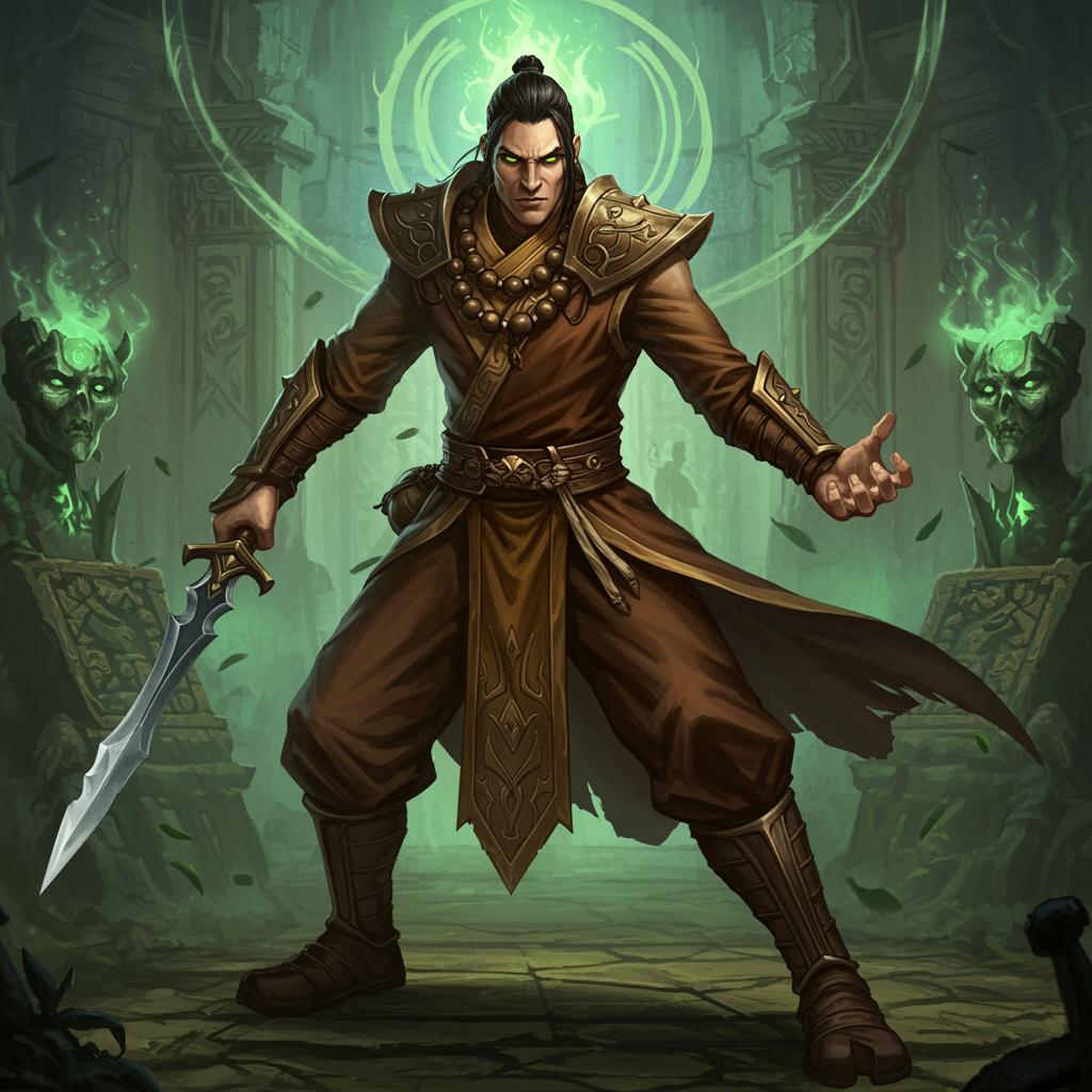 Photography of Kharazim from Diablo, standing full-length with a focused expression, the key light illuminating his facial features and monk attire. He is in a combat-ready stance, surrounded by an environment reflecting a mystical and spiritual atmosphere, with ancient temples, sacred artifacts, and glowing runes. The medium-wide shot captures a blend of anime, CGI, and video game aesthetic, bringing a dynamic and slightly stylized touch to the scene, with an emphasis on vibrant colors and exaggerated elements akin to a fantasy painting.