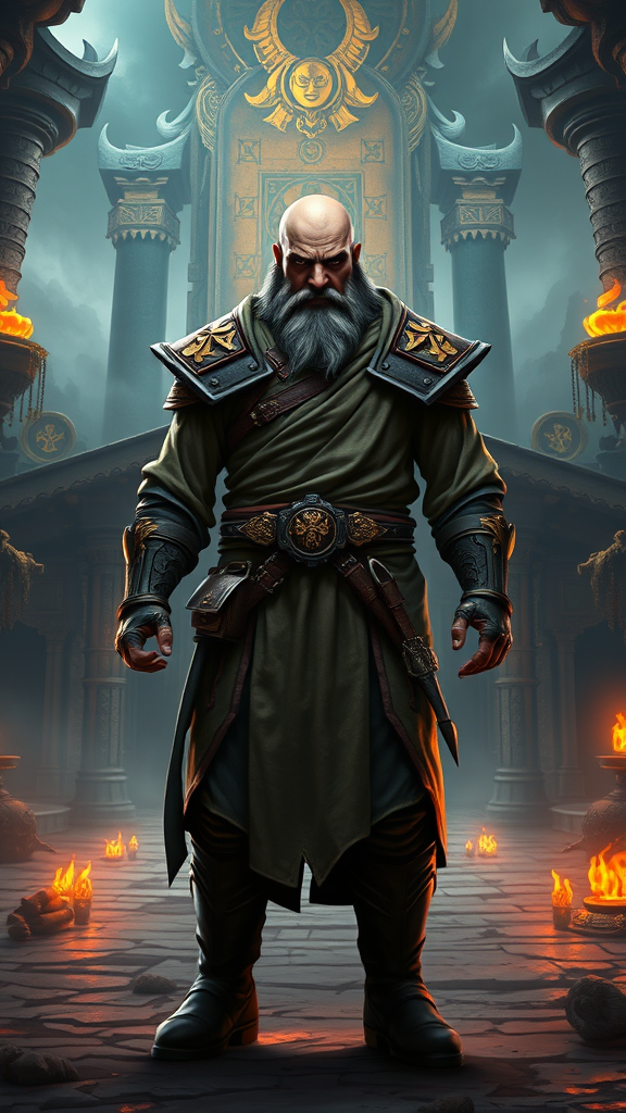 Photography of Kharazim from Diablo standing in a realistic, full-length depiction with a focused expression. Key light highlights his facial features and monk attire as he adopts a combat-ready stance. The environment is steeped in the game's mystical and spiritual atmosphere, featuring ancient temples, sacred artifacts, and glowing runes. Captured in a medium-wide shot with hints of anime, cartoon, manga, CGI, video game, and painting styles, adding subtle creative touches while maintaining the core concept's essence, including a sense of depth and dynamic presence.