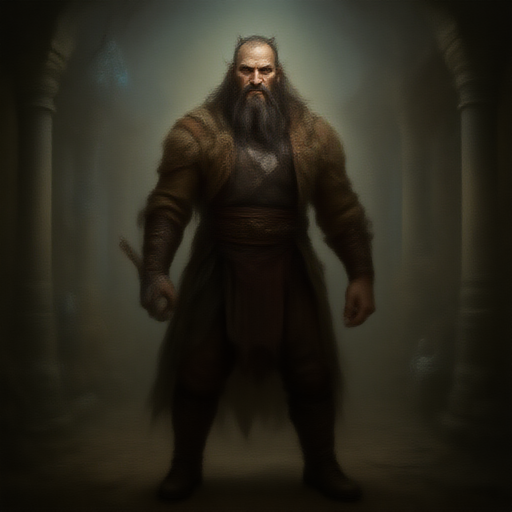 Photography of Kharazim from Diablo, standing realistically in a full-length pose with a focused expression; the key light highlights his facial features and monk attire in a combat-ready stance. The environment surrounds him with mystical and spiritual atmosphere elements like ancient temples, sacred artifacts, and softly glowing runes. Captured in a medium-wide shot, the scene combines elements of anime, cartoon, manga, CGI, and video game aesthetics with a painterly touch, enhancing its dynamic and immersive quality.