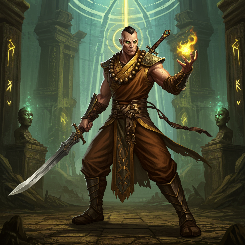 Photography of Kharazim from Diablo standing with a realistic, full-length depiction, featuring a focused expression. Key light highlights his facial features and monk attire as he stands in a combat-ready stance. The environment mirrors the game's mystical and spiritual atmosphere, complete with ancient temples, sacred artifacts, and glowing runes. The shot is medium-wide, blending elements of anime, cartoon, manga, CGI, video game, and painting styles for a rich visual presentation, capturing the essence of his character in this fantastical world.
