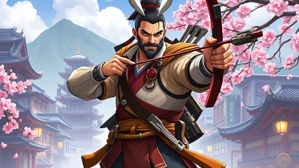 Photography of Overwatch's Hanzo in a realistic, full-length pose, capturing his intense expression as a key light highlights his facial features and traditional attire. Hanzo stands in a poised archery stance amidst an environment that mirrors the game's blend of futuristic and culturally rich elements, featuring Japanese architecture, cityscapes, and blooming cherry blossoms. The scene is captured in a medium-wide shot, blending elements of Anime, Cartoon, Manga, CGI, and Video Game art styles while adding a painting-like aesthetic for a unique touch.