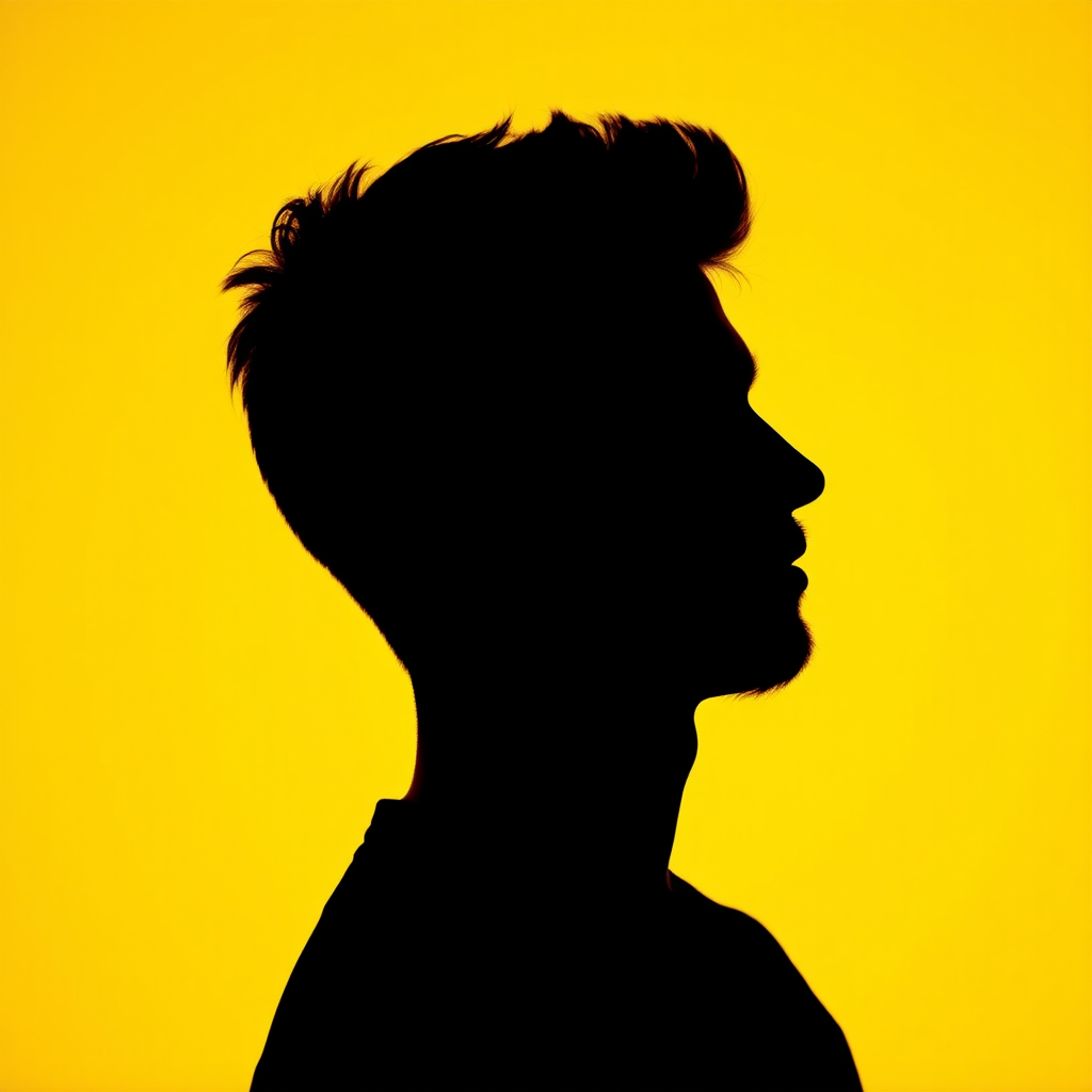 Photography portrait capturing the striking contrast of a manβs profile silhouette against a vivid yellow backdrop, using a camera setup that emulates a large aperture to accentuate the sharpness of the silhouette's edge. The low ISO keeps the colors rich and vivid, devoid of grain, in a photorealistic ultra-high definition. The scene unfolds in a 9:16 aspect ratio, subtly introducing elements of controlled randomness and preserving its natural aesthetic in a raw style, while maintaining the original essence and intensity of the composition.