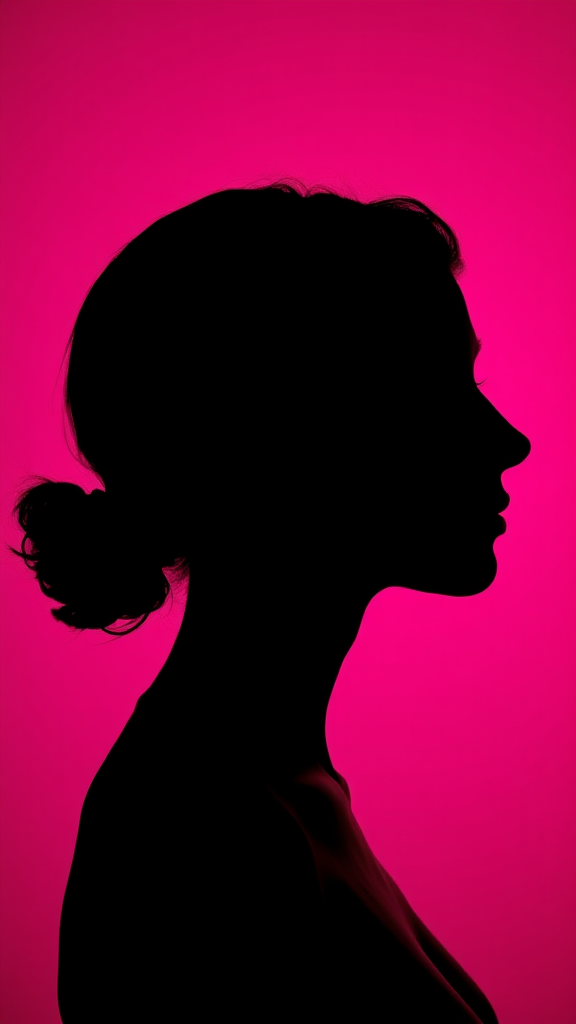 Photography portrait featuring a stark contrast profile silhouette of a woman against a vivid hot pink background. The camera setup emulates a large aperture, ensuring sharp focus on the silhouette's edge, with a low ISO to preserve deep color richness and minimal grain. The scene is photorealistic and ultra-high-definition, capturing every detail in a raw, unfiltered style, emphasizing the dramatic interplay of light and shadow within a 9:16 aspect ratio and introducing a subtle sense of dynamism and unpredictability.