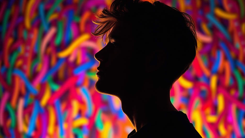 Photography portrait of a man model in profile with a compelling contrast against a dynamic multicolored backdrop. The lighting brings out the contours of his face and hair, creating a captivating dance of light and shadow. The colors are vivid and random, sharply standing out. Captured with a camera setup that emulates a large aperture, f/1.4, delivering a shallow depth of field that sharply focuses on the edge of the silhouette. Rendered in ultra-high definition, --aspect ratio 9:16 --style raw.