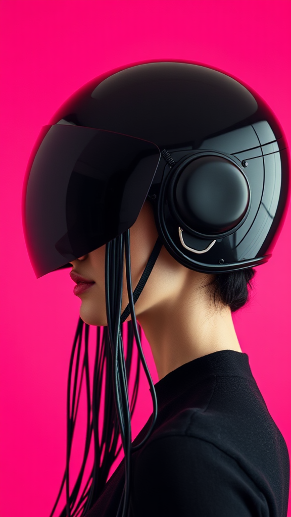 Photography portrait of contrast, profile silhouette of a woman wearing a glossy black helmet that obscures her eyes. The helmet features intricate details with long, flowing cables and metallic tubes extending downwards, mimicking sleek, wet black hair. Her pale, delicate face has a serene expression with soft pink lips, partially hidden by the headgear. Against a vibrant hot pink backdrop, the focus is on the silhouette's edge, achieved with a camera setup reminiscent of a large aperture, maintaining color richness and avoiding grain with a low ISO. The image is photorealistic in ultra-high definition, with subtle creative variations while preserving the original concept.