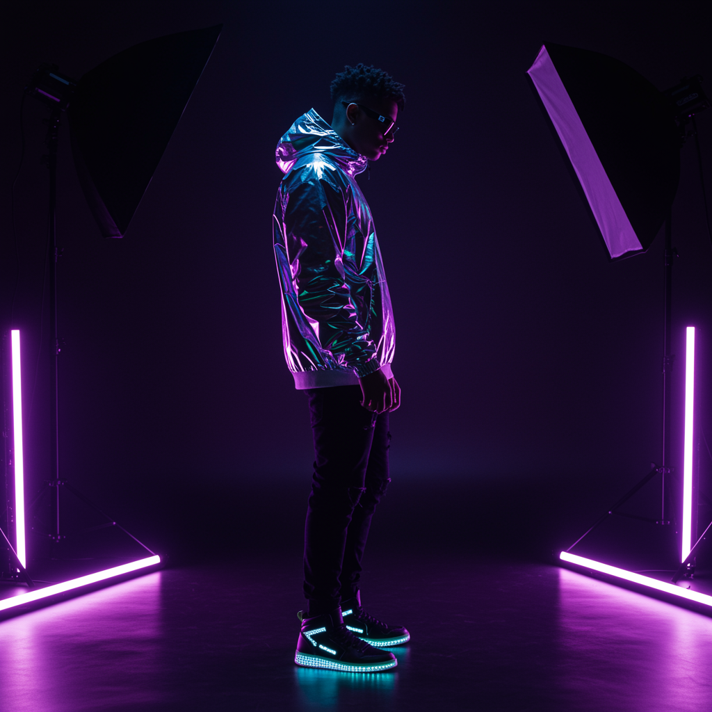A fashion photography scene featuring a professional male model captured with a Canon EOS R3 using a 50mm f/1.2 RF lens at f/2.8 settings, 1/160s, ISO 1600. The model showcases a streetwear look with a holographic effect on the clothing and glowing sneaker soles. The backdrop is dark with deep purple atmospheric lighting, with a professional studio setup consisting of two LED strip lights at floor level and one overhead softbox. The scene embodies a cyberpunk aesthetic, capturing the model in a dynamic side profile pose with a silhouette effect, featuring dramatic contrast and ultra-sharp, photorealistic detailing. The image is rich in detail with a gradient neon violet vibe, adjusted to maintain an engaging composition, and emphasizes the texture and color of the garments.