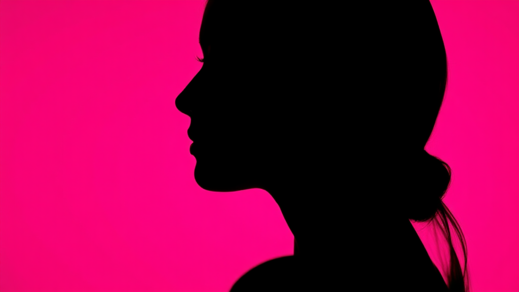 Photography shot capturing the striking contrast of a woman's profile silhouette against a vivid hot pink background, utilizing a camera setup with a large aperture to focus intensely on the sharp edge of the silhouette, while a low ISO preserves the depth and richness of the color without introducing grain, creating a photorealistic, ultra-high-definition image. The aspect ratio is tall, accentuating the elegant form, and the style is raw with minimal chaos introduced to maintain the integrity of the scene.