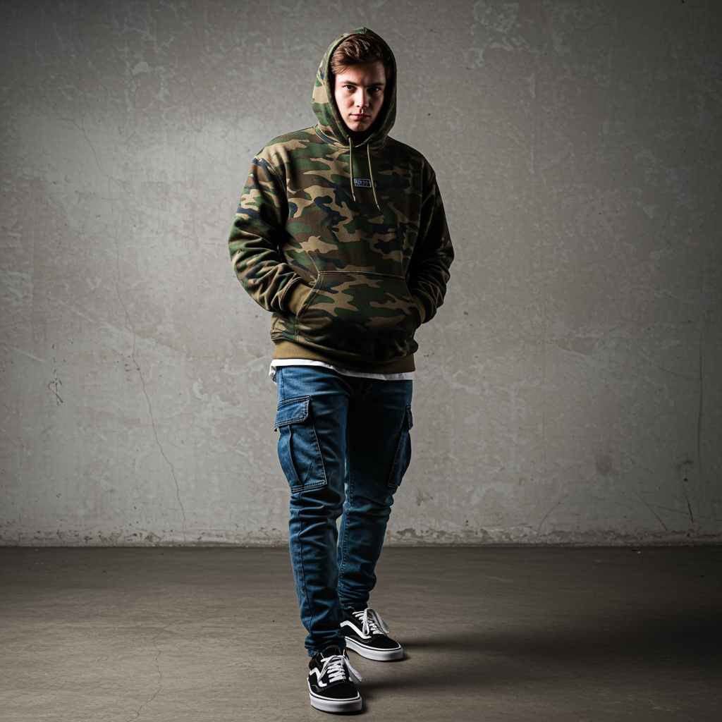 Photography, snapshot, male model, front pose, entire figure, enveloped in a swirl of blurred motion, dressed in a camouflage-patterned oversized hoodie and rugged denim cargo pants, classic Vans sneakers, Sony α9, minimalist open space contrasting with fleeting silhouettes around him, understated textured wall backdrop to emphasize the dynamic motion effect, vivid details --ar 9:16 --style raw --stylize 700 --v 6.1