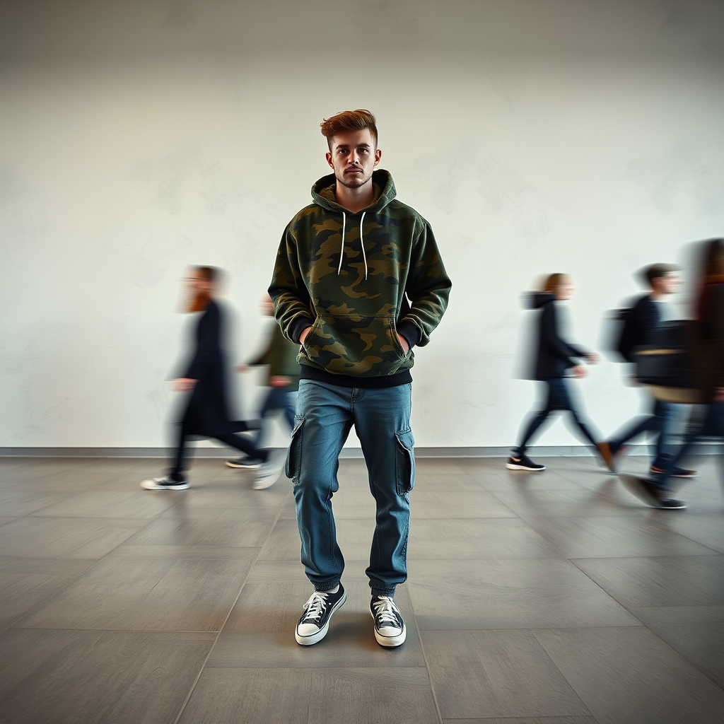 Photography, snapshot, male model, front pose, full-body, enveloped by a swirl of motion blur, wearing a camouflage-patterned loose-fit hoodie and denim cargo pants, Vans sneakers, captured with a Sony α9, in a minimalist open space contrasting with transient figures around him, plain wall background featuring subtle textures to maintain focus on the motion effect, with rich details, evoking an urban yet dynamic vibe and immersing the viewer in the energy of the scene.