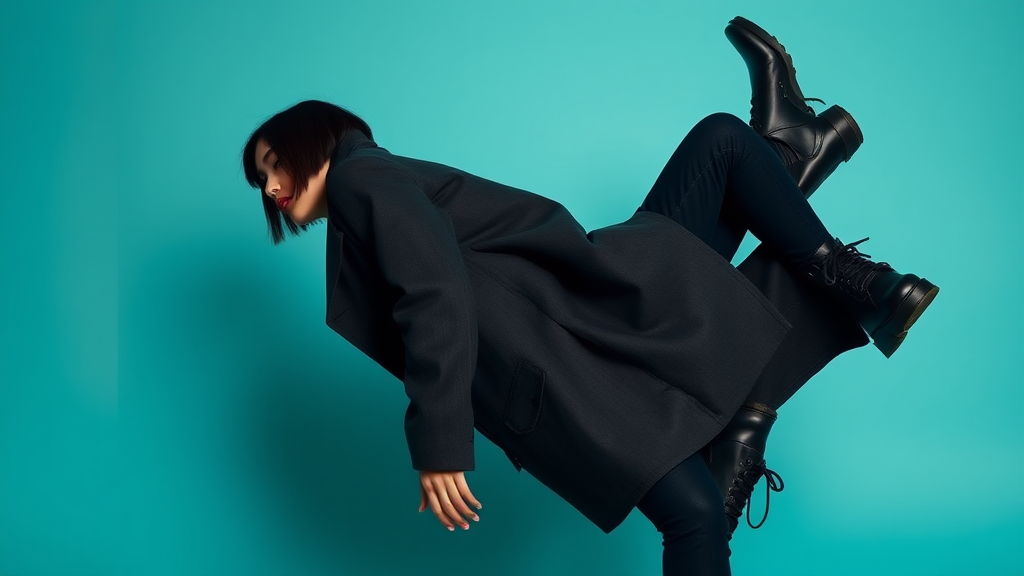 Photography, striking close-up, female model in dynamic side pose, leaning backwards at a 20-degree angle, head slightly turned, chic hairstyle, bold expression, sleek full-length charcoal coat, dark cargo jeans, untied shoelaces on matte black combat boots, minimalist fashion, captivating silhouette against a cool teal gradient background, intricate details