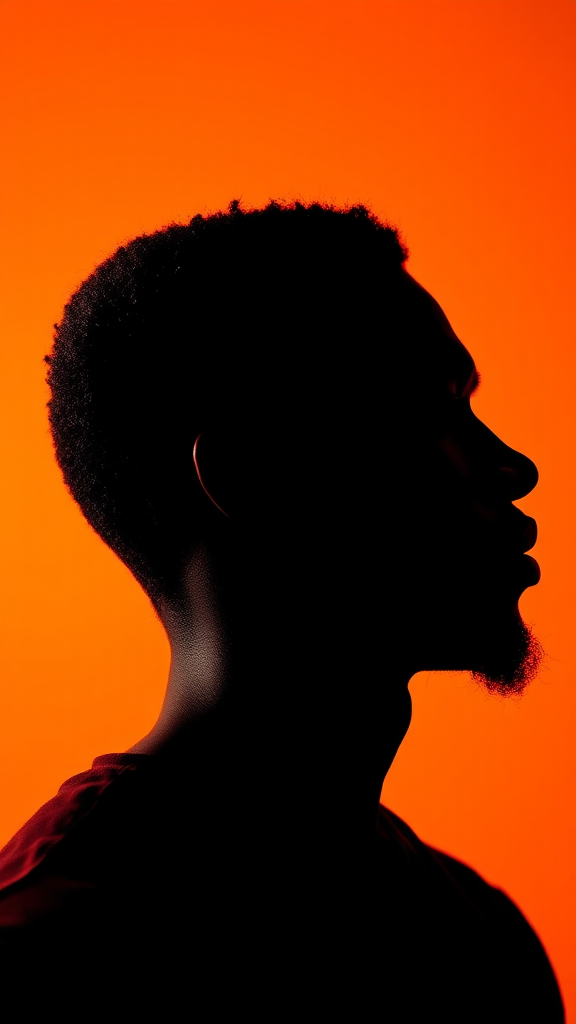 Photography, striking portrait of contrast showcasing the profile silhouette of a black man against a vivid orange background, captured using a camera setup emulating a wide-open aperture to focus intensely on the sharp, defined edges of the silhouette. A low ISO setting preserves the depth and purity of color, eliminating grain for an immersive, photorealistic experience. The composition is in ultra-high definition with a vertical 9:16 aspect ratio, infused with subtle creative tweaks to enhance the raw, unfiltered style.
