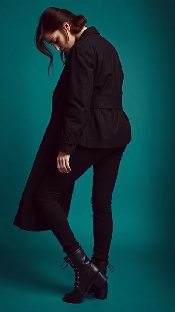Photography, upper body, female model in a striking side pose, gently leaning backwards at a 20-degree angle, head slightly bowed, chic hairstyle, intense gaze, sleek ebony trench coat, sleek black utility jeans, loosely laced matte black combat boots, minimalist fashion, captivating silhouette against a deep turquoise gradient background, intricate detail --ar 9:16 --style raw --personalize flveq4x --v 6. 1.