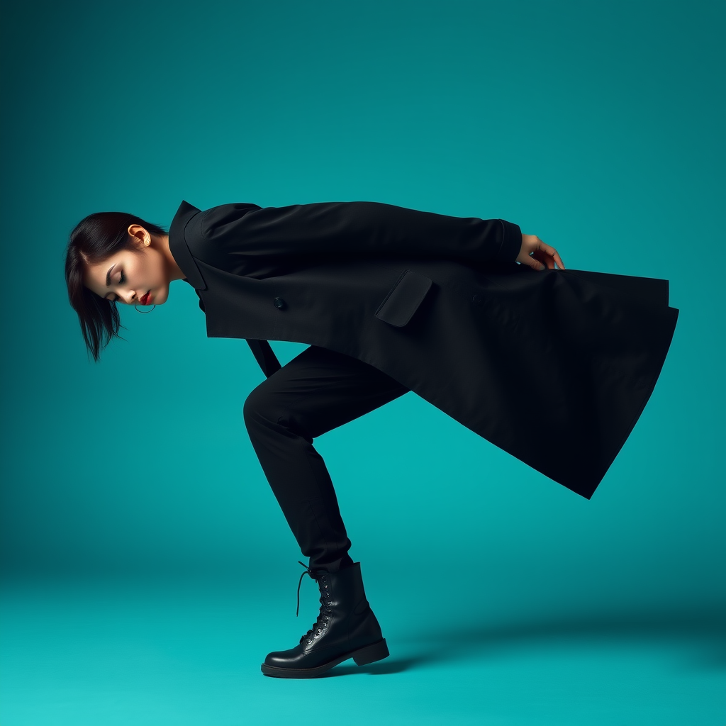Photography, upper body, female model in a striking side pose, leaning slightly backwards at a 15-degree angle, head gently bowed, chic hairstyle, alluring expression, sleek minimalist black trench coat, black cargo pants, loosely tied matte black combat boots, minimalistic fashion, bold silhouette against a cool teal gradient background, intricate detail --ar 9:16 --style unrefined --personalize flveq4x --v 6.1