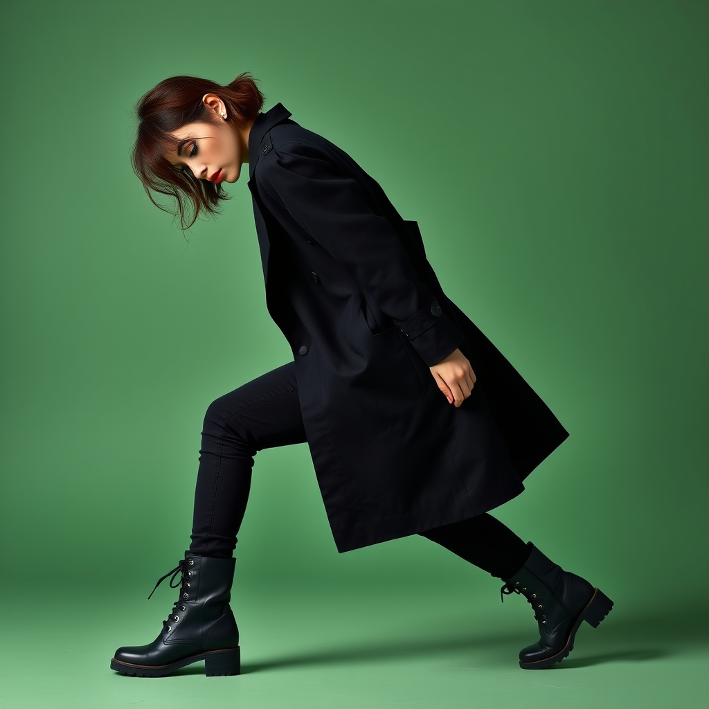 Photography upper body female model in an expressive side pose leaning slightly backwards head gently tilted down chic hairstyle with a captivating look sleek minimalist black trench coat paired with dark cargo jeans and matte black military boots with untied laces exuding minimalist fashion elegance dramatic silhouette contrasting against a tranquil emerald gradient background showcasing intricate detail