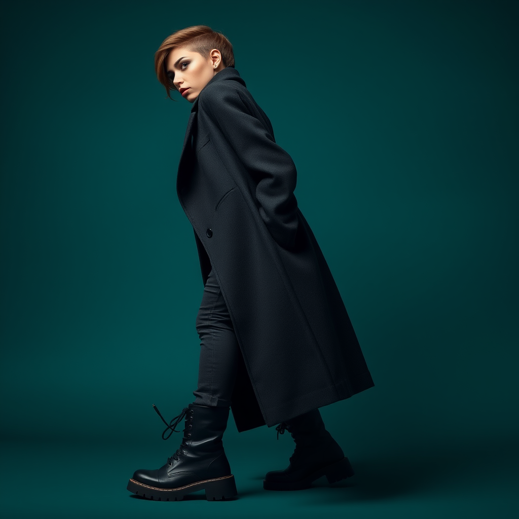 Photography, upper body, female model in an intriguing side pose, arching backwards at an angle of 20 degrees, chin slightly tucked, with an avant-garde hairstyle, intense gaze, sleek full-length charcoal coat, charcoal tactical jeans, loosely tied laces on rugged matte black combat boots, minimalist chic, striking silhouette against a deep jade gradient backdrop, sumptuous detail.