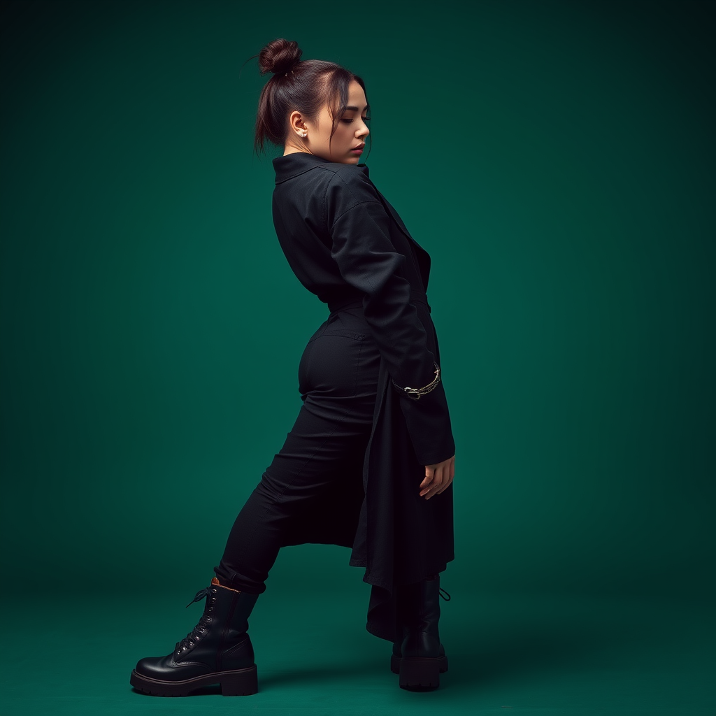 Photography, upper body, female model striking a bold side pose, reclining backwards at a subtle 15-degree angle, head gently bowing down, chic and intricate hairstyle, captivating gaze, sleek and minimalistic black trench coat, dark cargo jeans, loosely laced matte black combat boots, contemporary minimalist fashion, striking silhouette contrasted against a deep emerald gradient backdrop, vivid detail
