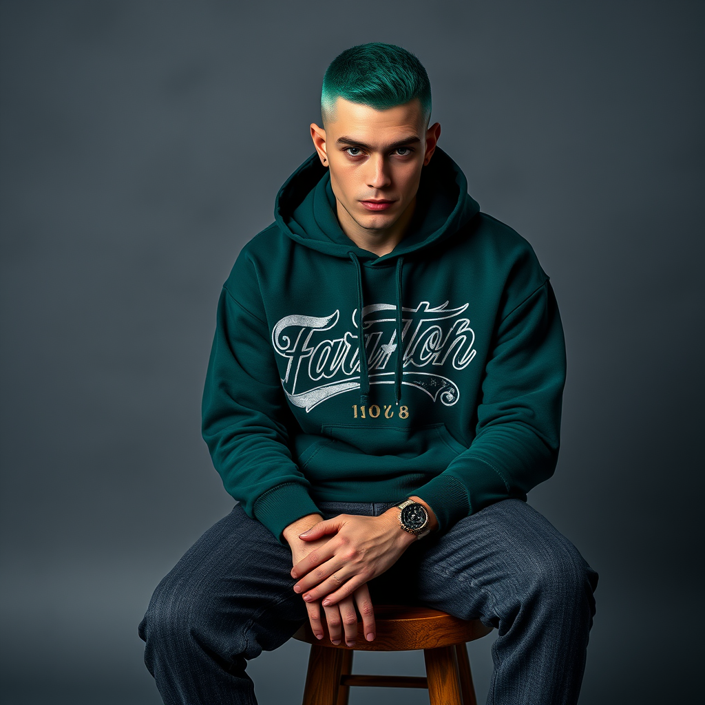 Photography, wide-angle shot, male model seated on a stool, vibrant emerald undercut, deep forest green loose-fit hoodie adorned with gothic tattoo-style lettering, garment-dyed charcoal denim jogger pants, captured using Sony α9 II with a Sony FE 100-400mm f/4.5-5.6 GM OSS lens, set against a smoky grey studio background. The model's gaze is direct, conveying intensity with realistic, high-contrast imagery accentuated by dramatic lighting effects --ar 9:16 --style raw --stylize 700 --v 6.