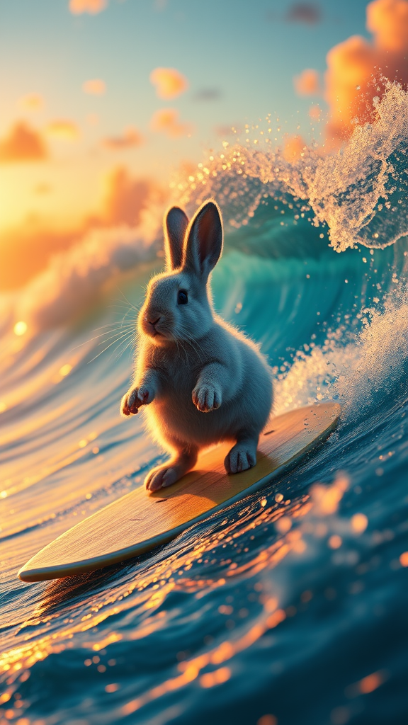 Photorealistic 32k image of a fluffy baby bunny riding a surfboard on a towering ocean wave, with the golden hues of a setting sun casting cinematic lighting across the scene, capturing the bunny's fur shimmering in the warm glow and creating a dramatic silhouette against the vibrant colors of the sky.
