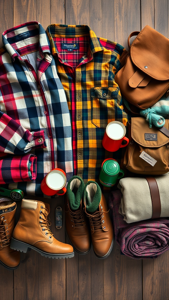 Photorealistic arrangement of 1960s-style camping attire laid out meticulously, featuring vintage plaid flannel shirts, worn leather hiking boots, classic woolen socks, retro canvas backpacks, colorful enamelware mugs, a vintage compass, and rolled wool blankets on a rustic wooden surface, capturing a nostalgic outdoor adventure vibe with subtle modern accents.