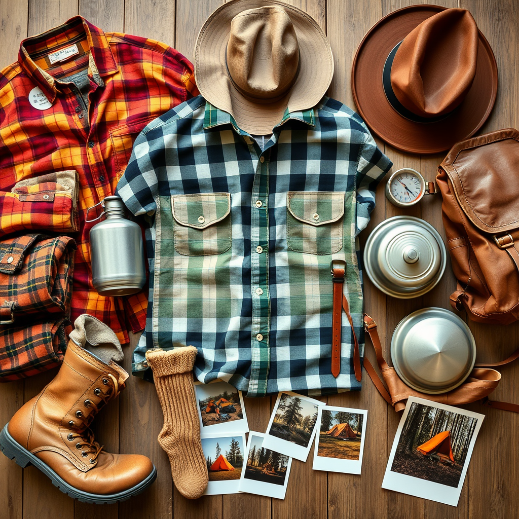 Photorealistic arrangement of 1960s style camping wear laid out in meticulous order, featuring vintage plaid flannel shirts, canvas hiking boots, classic aluminum canteens, woolen socks, retro camping hats with wide brims, leather backpacks with brass buckles, old-fashioned compasses, tin dining sets with enamel plates, and a folded map of iconic camping destinations. Add a touch of nostalgia with faded Polaroid photos showing campfire settings and tents pitched in forest clearings.