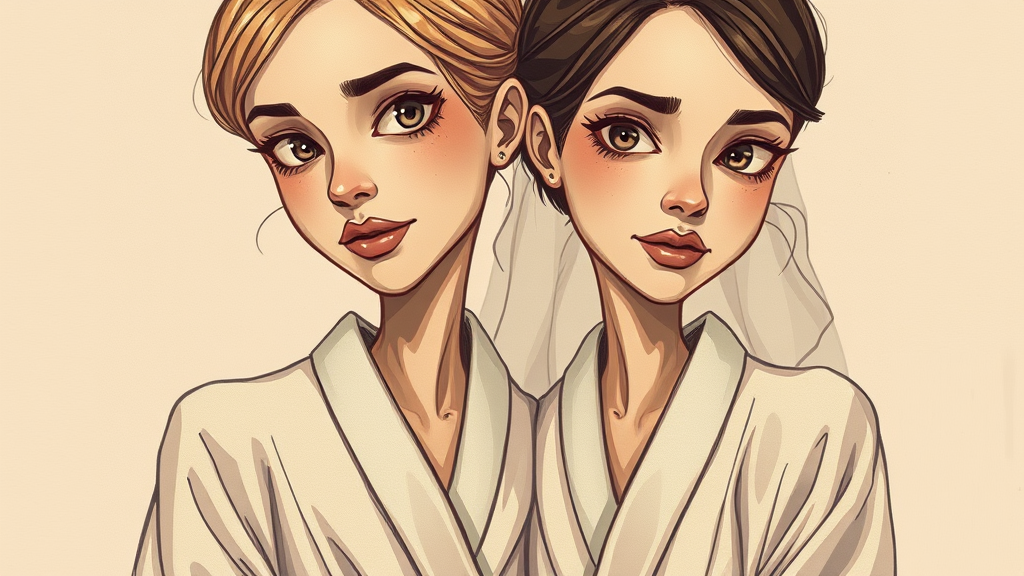 Photorealistic, award-winning, hyperrealistic, highly detailed bridal robe illustration with a 3D effect, reminiscent of an analog photo with film grain and slight imperfections. Sepia-toned painting style blends elements of cartoons and sketches. Features two faces with an emphasis on authentic expressions, embracing a mix of low-resolution charm and normal quality. Captures the essence of flawed beauty with subtle hints of abstract creativity, ensuring an engaging visual experience without logos or signatures, while maintaining a unique and evocative composition.