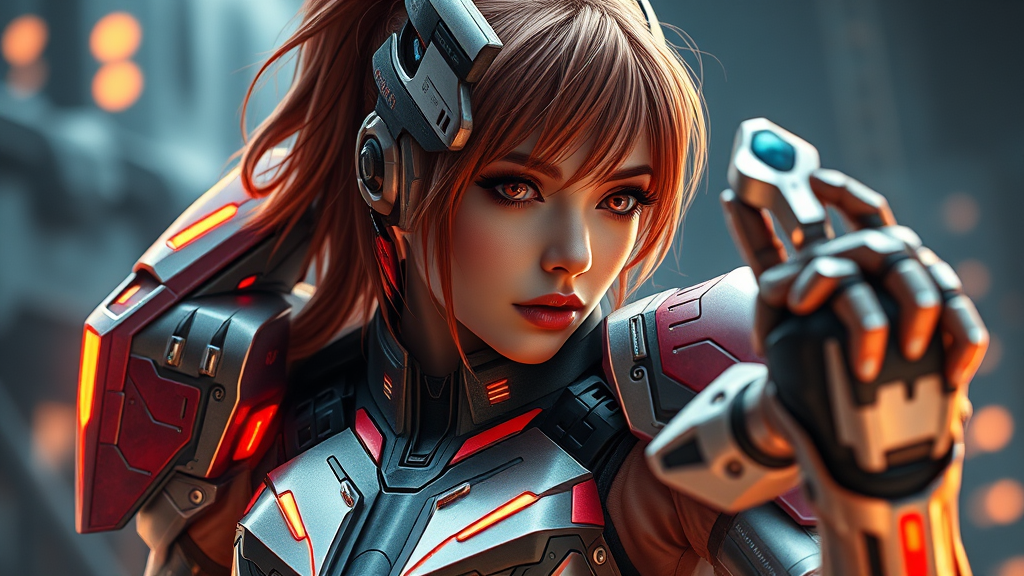 Photorealistic depiction of stunning Asuka Langley donning futuristic sci-fi armor, intricate details highlighting her striking features and dynamic pose, set against a dramatic backdrop, emphasizing the sleek design and vibrant colors of the armor, capturing an essence of action and intensity, maintaining a cinematic 16:9 aspect ratio with a focus on high-quality resolution and depth.