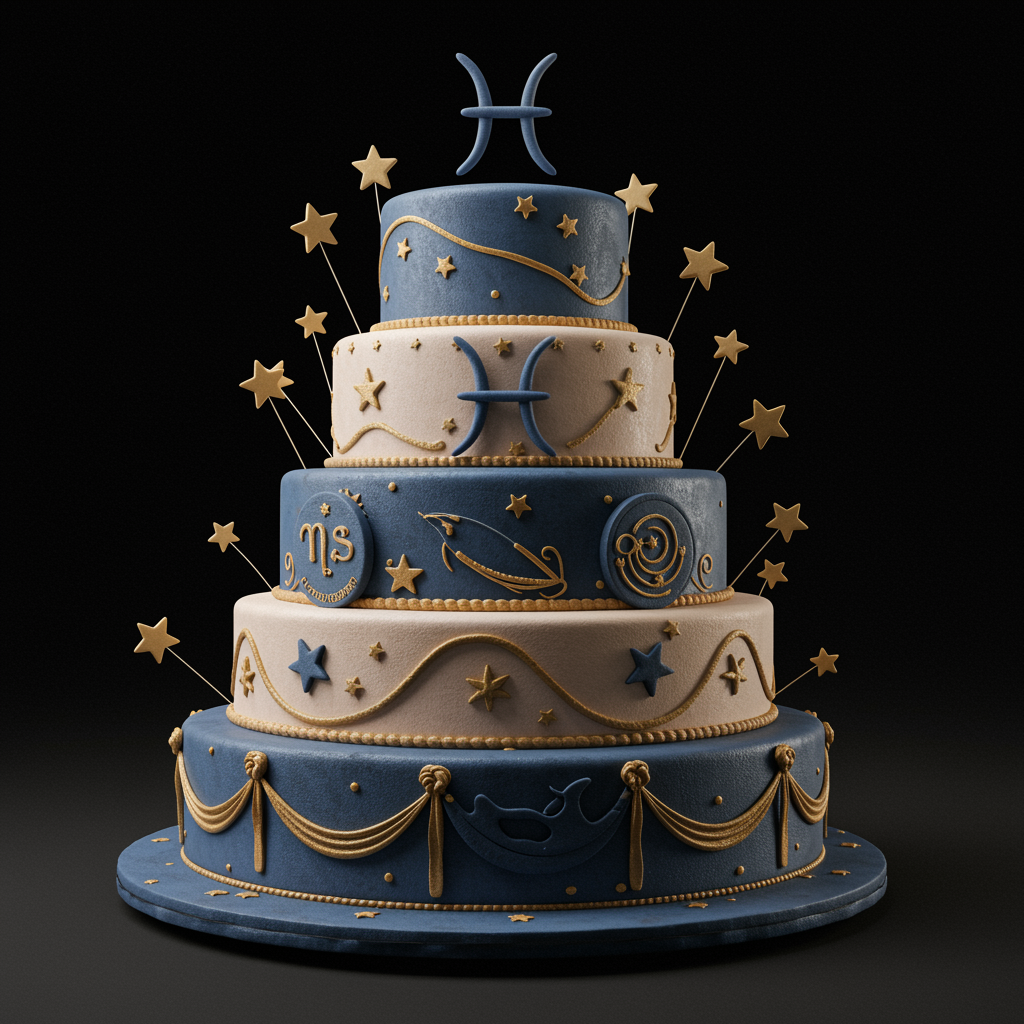 Photorealistic digital art of a Pisces-inspired wedding cake, intricately decorated with bright stars and elegant baroque style elements. The cake is presented in a three-quarter view, showcasing detailed textures and a sophisticated design. It features ambient lighting that casts a gentle glow, enhancing the depth of field and highlighting its artistic elegance.