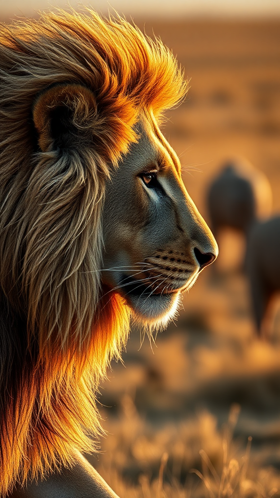 3D photorealistic image showcasing a side profile of a majestic lion prowling the Serengeti, extreme close-up, capturing the intricate details of its mane and focused gaze, inspired by Frans Lanting's style. Photographed with a Canon EOS R3 using a 70-200mm lens, vividly filling the entire frame in ultra-high-resolution, embodying the raw beauty and power of the wild. Composition emphasizes rich textures of the lion's fur illuminated by warm, golden light of the late afternoon, set against a softly blurred background hinting at the vast savannah landscape, enhancing the sense of untamed wilderness with stylized artistic flair.