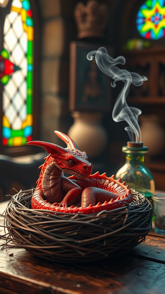 Photorealistic image of a small crimson dragon curled up asleep in its nest, resting on a medieval wizard's table. The scene is captured through a macro lens with an f/2.8 aperture, emphasizing intricate details. Morning light streams through a nearby stained glass window, casting vibrant colors and illuminating the setting. Whimsical steam shapes rise gently from a potion bottle, enhancing the atmosphere of comfort and magic. The environment draws from the worlds of LOTR, DnD, and RPGs, rendered in stunning 16K, with realism that would make a 3D masterpiece.