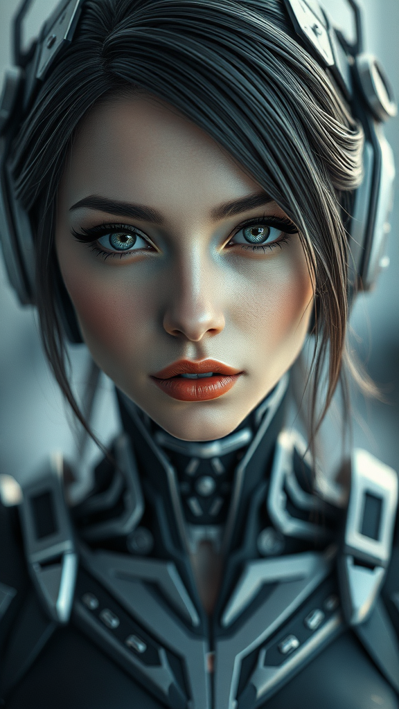 Photorealistic image of a woman with robotic elements, featuring digital 3D design, intricate hard surface details, and real-time VFX effects; character design is highly detailed and trending on ArtStation with sharp focus and UHD quality. The image boasts HDR effects and intriguing framing, embracing artistic imperfections like subtle blurring and unconventional proportions. The composition includes an artist signature and abstract symbols, alluding to watermarks and words, subtly integrated within the design.