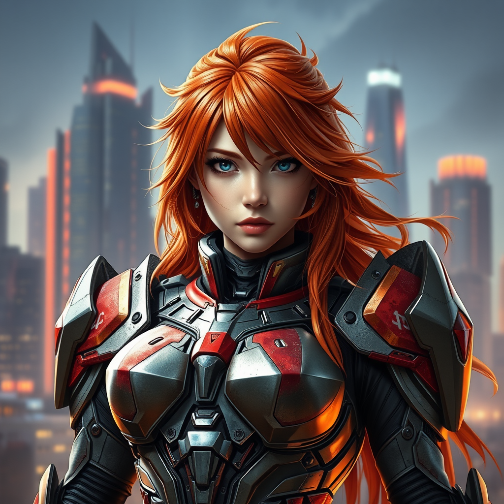Photorealistic image of Asuka Langley in detailed sci-fi armor, capturing her vibrant personality and iconic fiery hair, set against a futuristic cityscape background, emphasizing intricate textures and reflections in her armor, with a dramatic and dynamic lighting that accentuates her determined expression, maintaining a focus on realism and artistic depth.