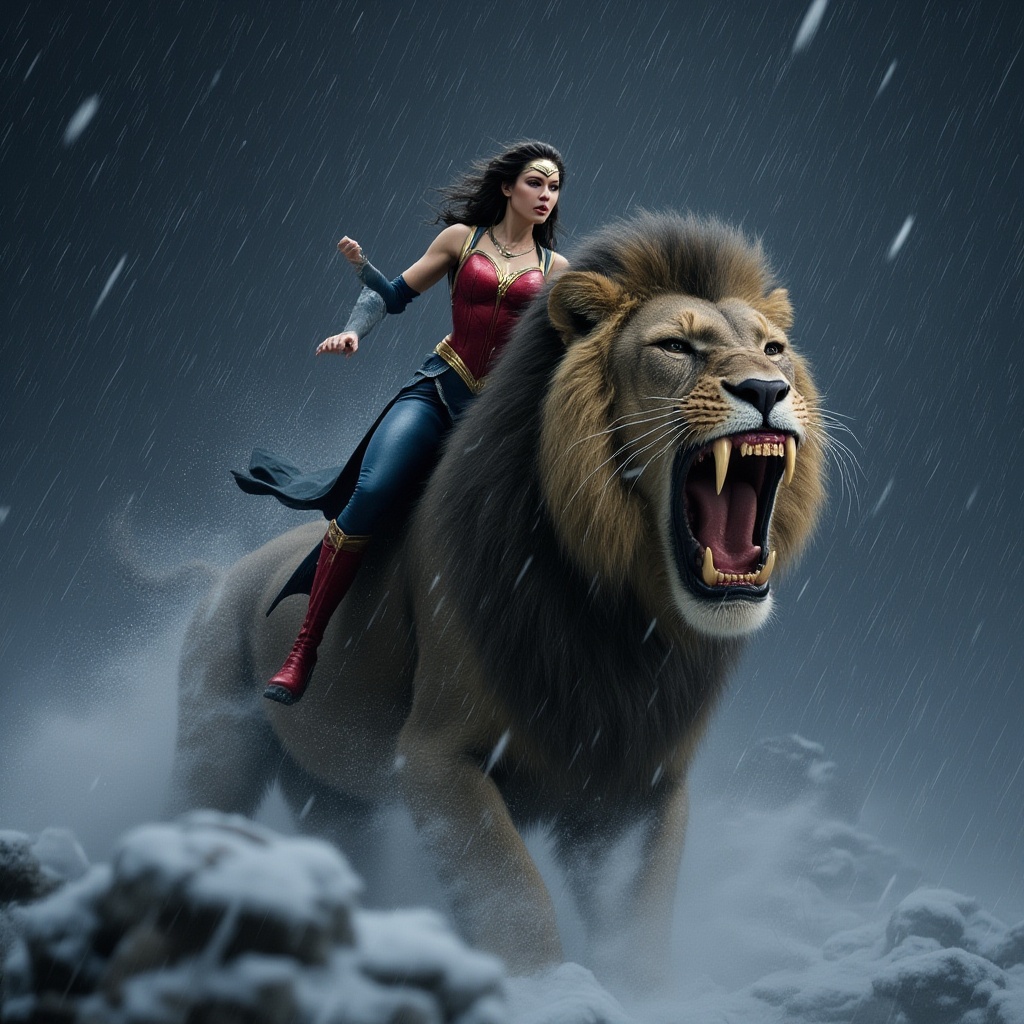 View this AI-generated image featuring a breathtaking photorealistic image of wonder woman fiercely riding on the massive head of a majestic armored lion in the midst of a turbulent winter storm snowflakes whip through the air adding drama and intensity to the scene as the lion s powerful roar echoe