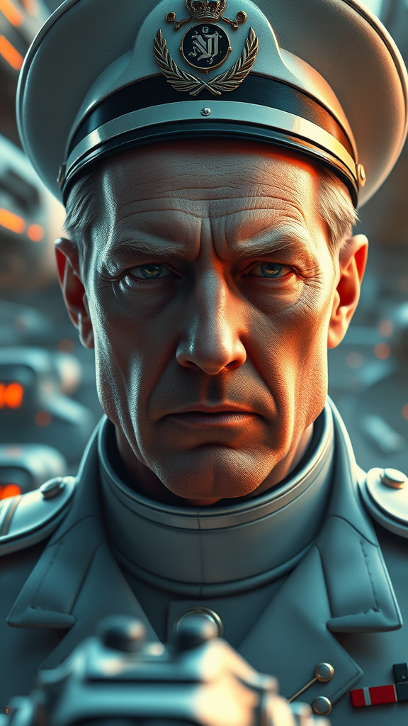 Photorealistic, intense look, anatomical photorealistic portrait of a human fleet admiral, inspired by iconic space operas like Star Wars, Star Trek, and Warhammer 40k, featuring elements akin to Admiral Spire. The subject is depicted without glasses, embodying the essence of a British officer. The art is characterized by reflections, high detail, and sharp focus amid a thrilling space battle. Drawing inspiration from artists like Artgerm, Greg Rutkowski, and Viktoria Gavrilenko, the scene utilizes ray tracing, neon lights, and global illumination to enhance the detailed skin and expressive eyes. Rendered in deep color and 8k resolution, achieving an art style that merges photorealism with a touch of fantastical elements. The scene lacks any distortion, maintaining realistic proportions and features, capturing a compelling, heroic figure at the heart of an interstellar conflict.