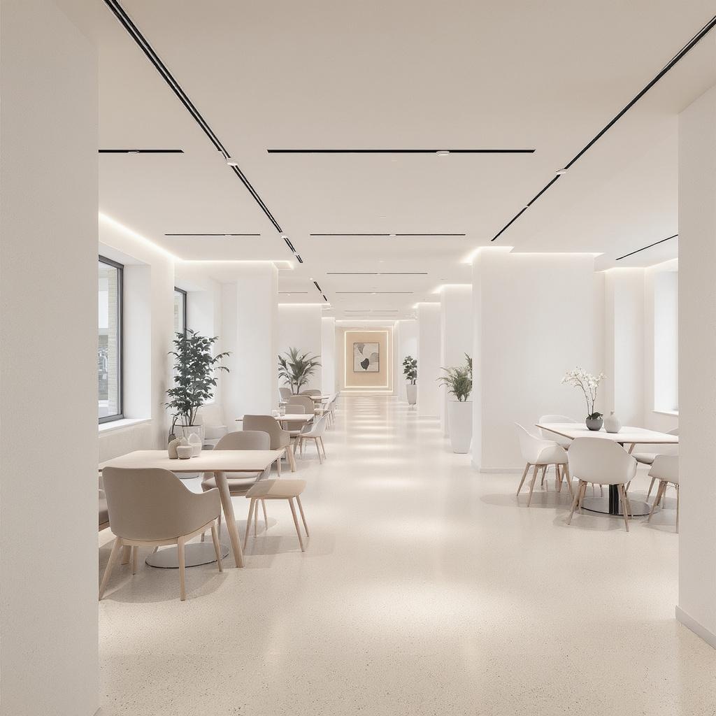 Photorealistic perspective view of a minimalist co-working space showcasing bright finishes and an ambient atmosphere, featuring a harmonious blend of vertical and horizontal elements. The interior is highlighted by minimalist lighting with 4500K indirect illumination complemented by sleek spotlights elegantly integrated into the ceiling. The professional interior architecture is captured in crisp detail, emphasizing a clean and functional aesthetic with subtle creative accents to enhance the space's inviting feel.