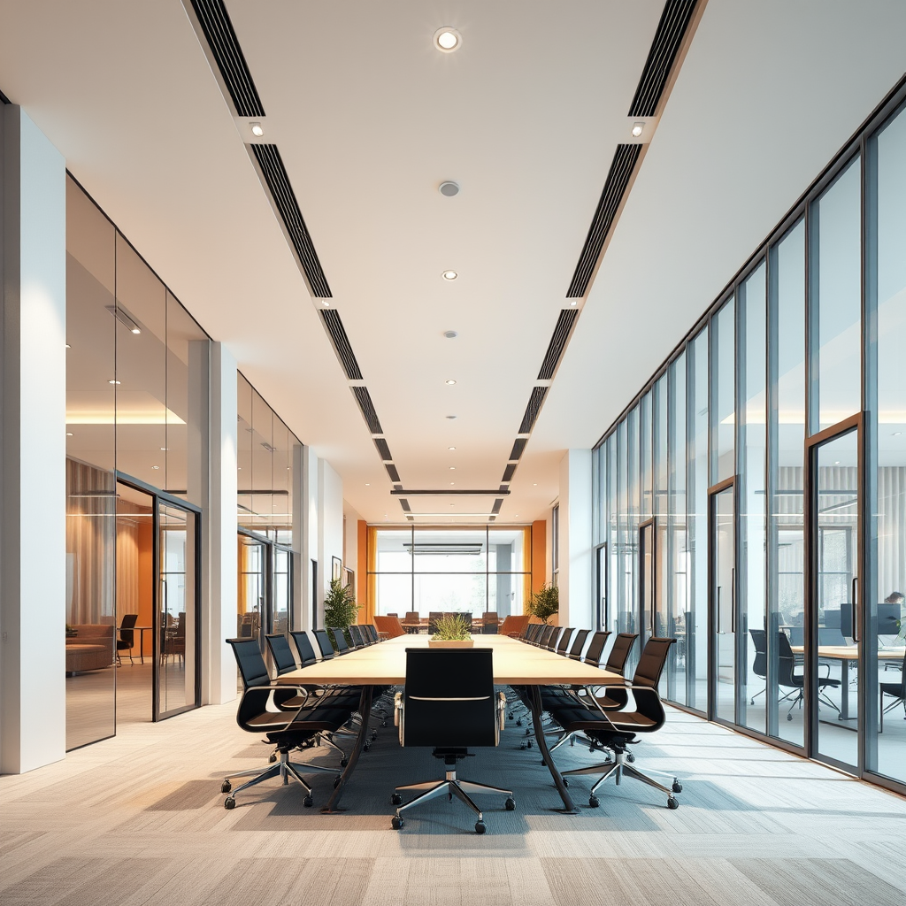 Photorealistic perspective view minimalist co-working space, bright ambient finishes with an emphasis on vertical and horizontal lines, minimalistic lighting featuring 4500K indirect light and sleek ceiling spotlights, professional interior architecture, expansive glass surfaces, natural textures, subtle pops of color, open and airy environment with a focus on simplicity and functionality.