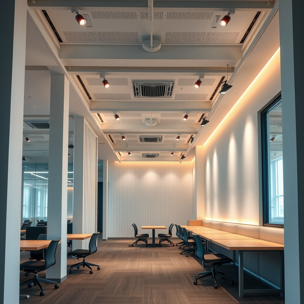 Photorealistic perspective view of a minimalist co-working space featuring bright finishes and a calm ambiance, intricate vertical and horizontal design elements, minimalist lighting with 4500K indirect illumination complemented by sleek spotlights on the ceiling, showcasing professional interior architecture, capturing a raw and stylized aesthetic with subtle creative enhancements for visual interest.