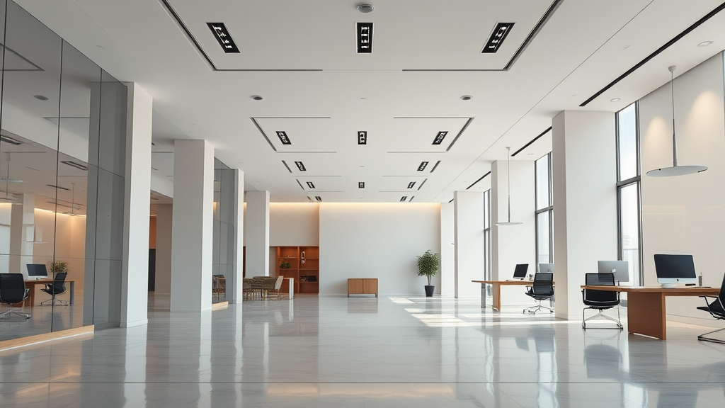 Photorealistic perspective view of a minimalist co-working space with bright finishes and ambient atmosphere, showcasing elaborate vertical and horizontal elements. Features minimalistic lighting with 4500K indirect light and sleek ceiling spotlights. Captures professional interior architecture in a raw style with an enhanced artistic touch, maintaining the essence of modern minimalism.