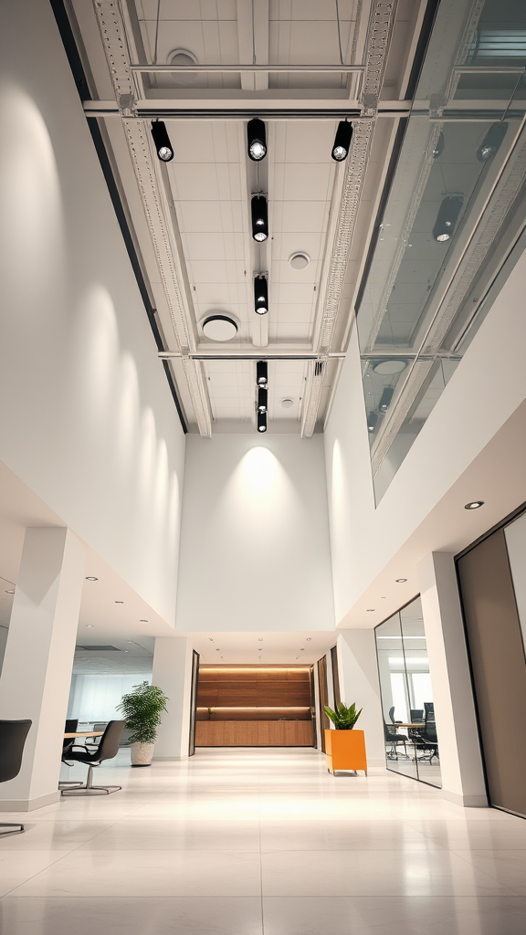 Photorealistic perspective view of a minimalist co-working space with bright finishes and ambient atmosphere, showcasing an intricate balance of vertical and horizontal design elements. The lighting is minimalist, featuring 4500K indirect light complemented by sleek spotlights on the ceiling. The interior architecture exudes professionalism, captured in a raw style with stylized detailing, emphasizing an uncluttered and modern aesthetic.